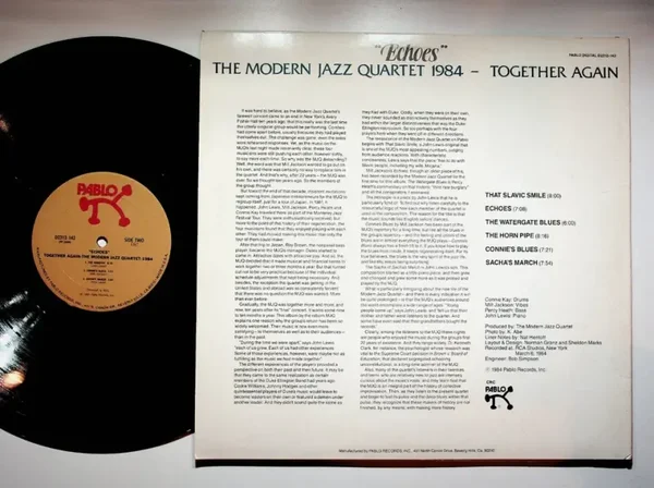 This image shows a collectible vinyl record album titled Echoes by The Modern Jazz Quartet, released in 1984 on the Pablo label.