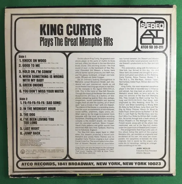 King Curtis : Plays The Great Memphis Hits (1967)Funk Soul LP Vinyl Record 33-211Record Grade: G(minor scratches through-out, priced accordingly)